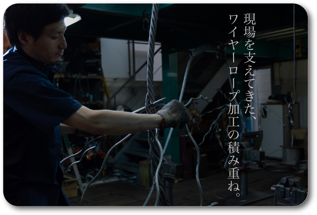 綱業商会は創業以来、船舶用品に使用されるワイヤーロープを中心にさまざまな現場で必要とされる加工を手がけてきました。