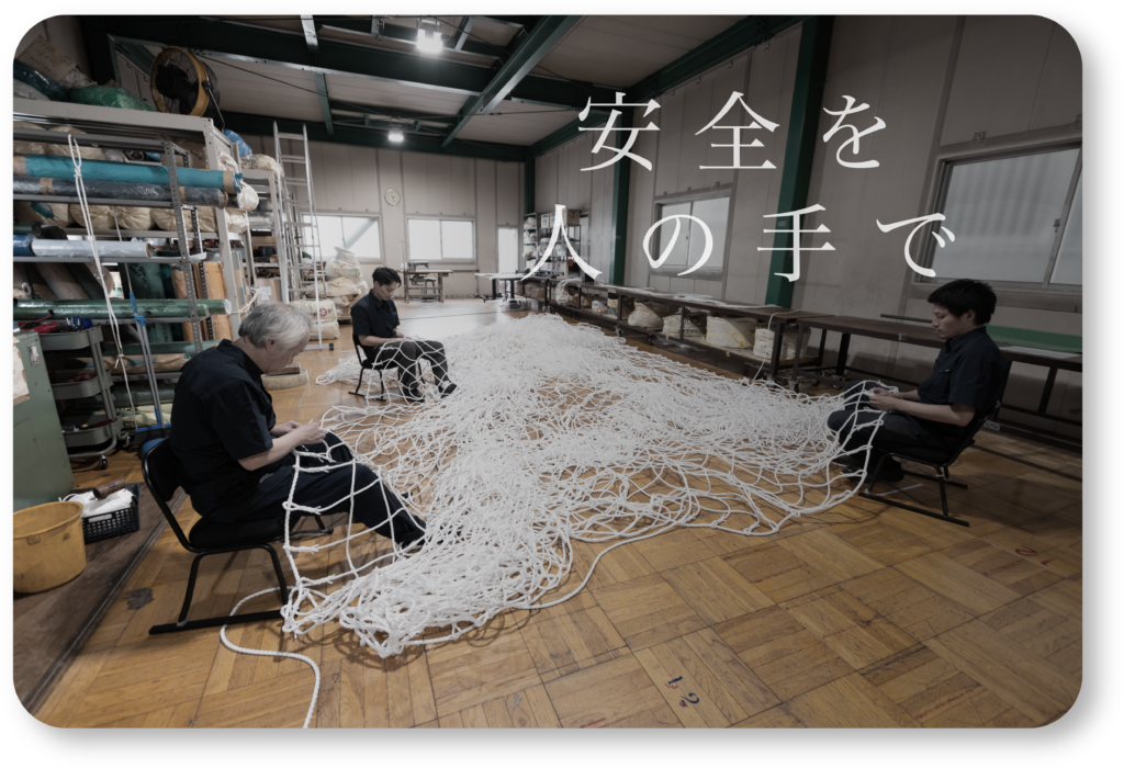 綱業商会では、ワイヤーロープ加工と並び、ロープを用いた手作業による加工を長年にわたり手がけてきました。 安全ネットやモッコといった製品は、既製品や機械による大量生産ではなく、 用途や設置環境に合わせた手編み加工を基本としています。 使用される現場や作業条件を丁寧に確認し、 編み方や寸法を一つひとつ調整しながら製作。 現場で「無理なく使える」「安全に使える」ことを第一に、 人の手による確かなロープ加工を行っています。
