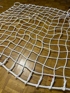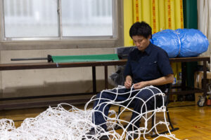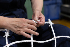 安全ネットやモッコといった製品は、既製品や機械による大量生産ではなく、用途や設置環境に合わせた手編み加工を基本としています。